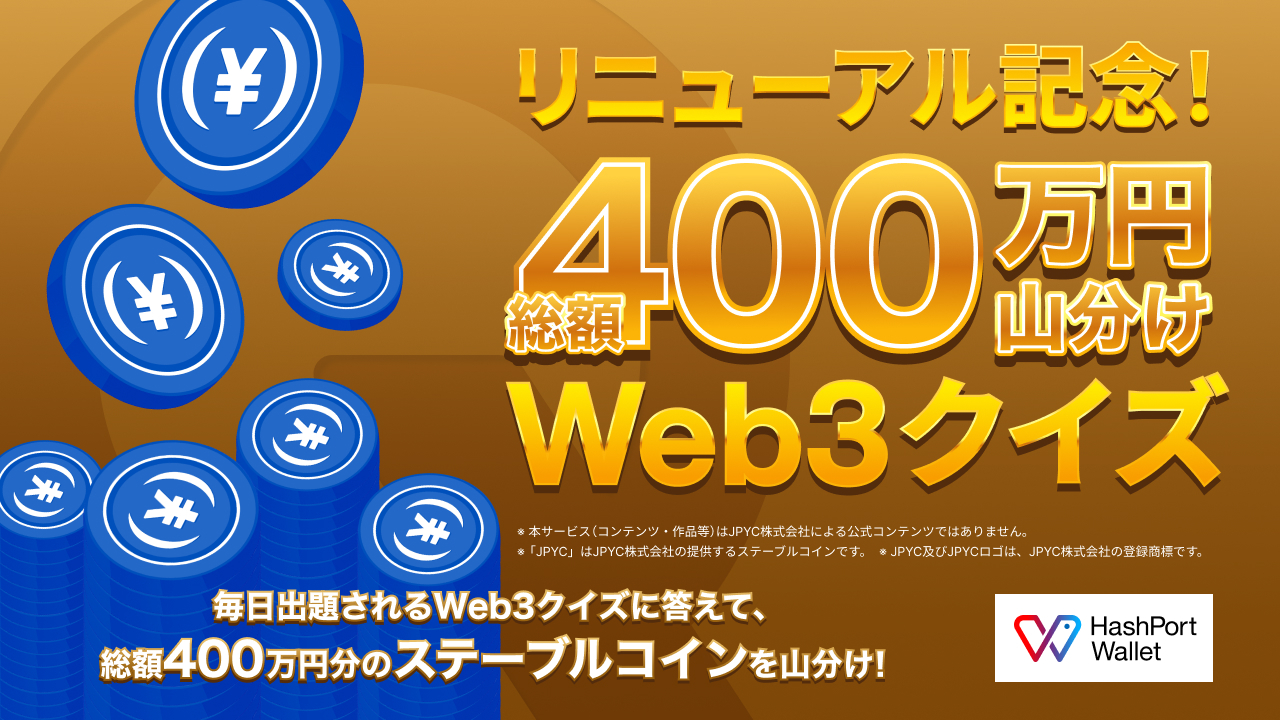 Web3って何?から始める!10月17日にスタートした「リニューアル直前!Web3クイズ」が、4週連続での開催が決定!本日から第2週がスタートです! デジタル資産がもっと身近に、もっと自由に使えるようになる――そんな新し... 詳しくはこちら