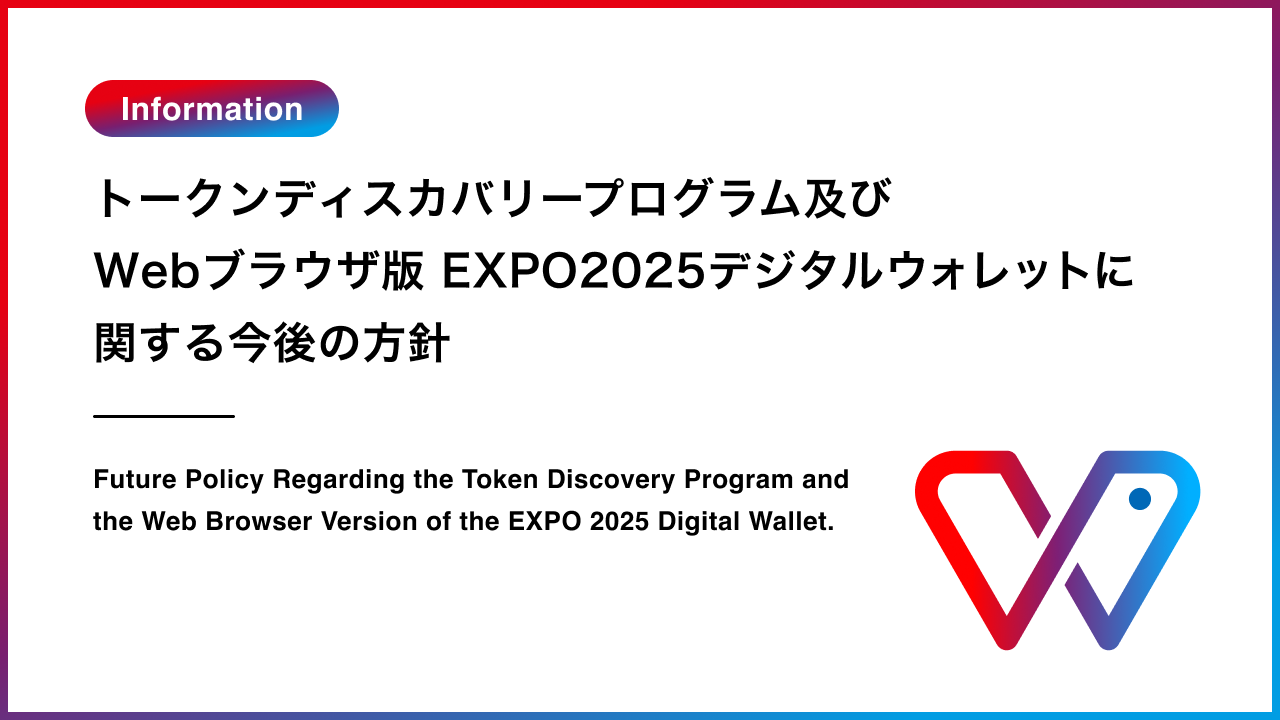 本ページでは、「トークンディスカバリープログラム(会員証機能)」および「EXPO2025デジタルウォレット(Webブラウザ版)」に関する今後の方針をご案内いたします。